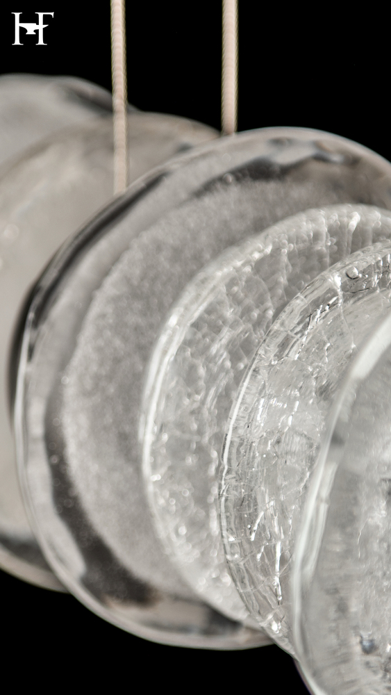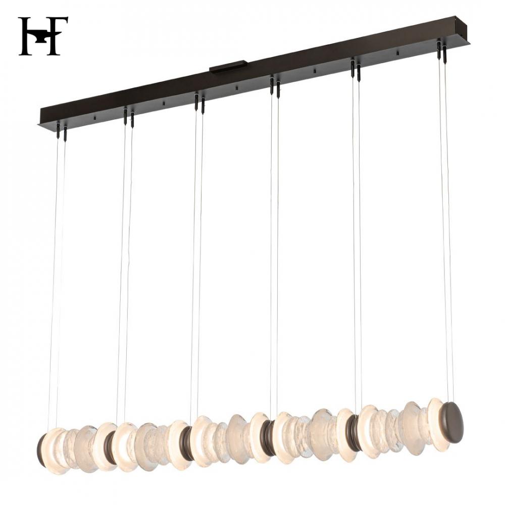 An addition to the Cairn Collection, this pendant tips the vertical glass "stone" stacks to a horizontal in this wonderful linear version. Round, textured clear and bubble glass of varying diameters are positioned side by side. Each of five "stacks" is bookended by metal, stone-shaped LED modules to great visual effect. Cable-hung, the Cairn Linear LED Pendant boasts a 4.7ft expanse, creating a stunning piece that is at home over a kitchen island, bar or reception counter, a dining table, a billiards table, and more.