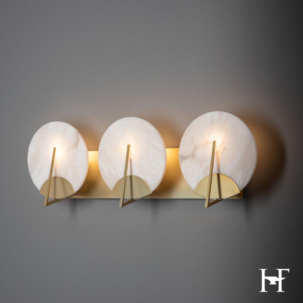 Natural alabaster discs from Spain is positioned before three lights and held with beautiful handcrafted steel semi-circles and a vertical steel tige for a contemporary touch. Designed by Ori Goldberg, this elegant 3-Light Bath Sconce joins the Callisto Collection that includes a semi-flush, a 1-light sconce and a beautiful 7-light pendant.