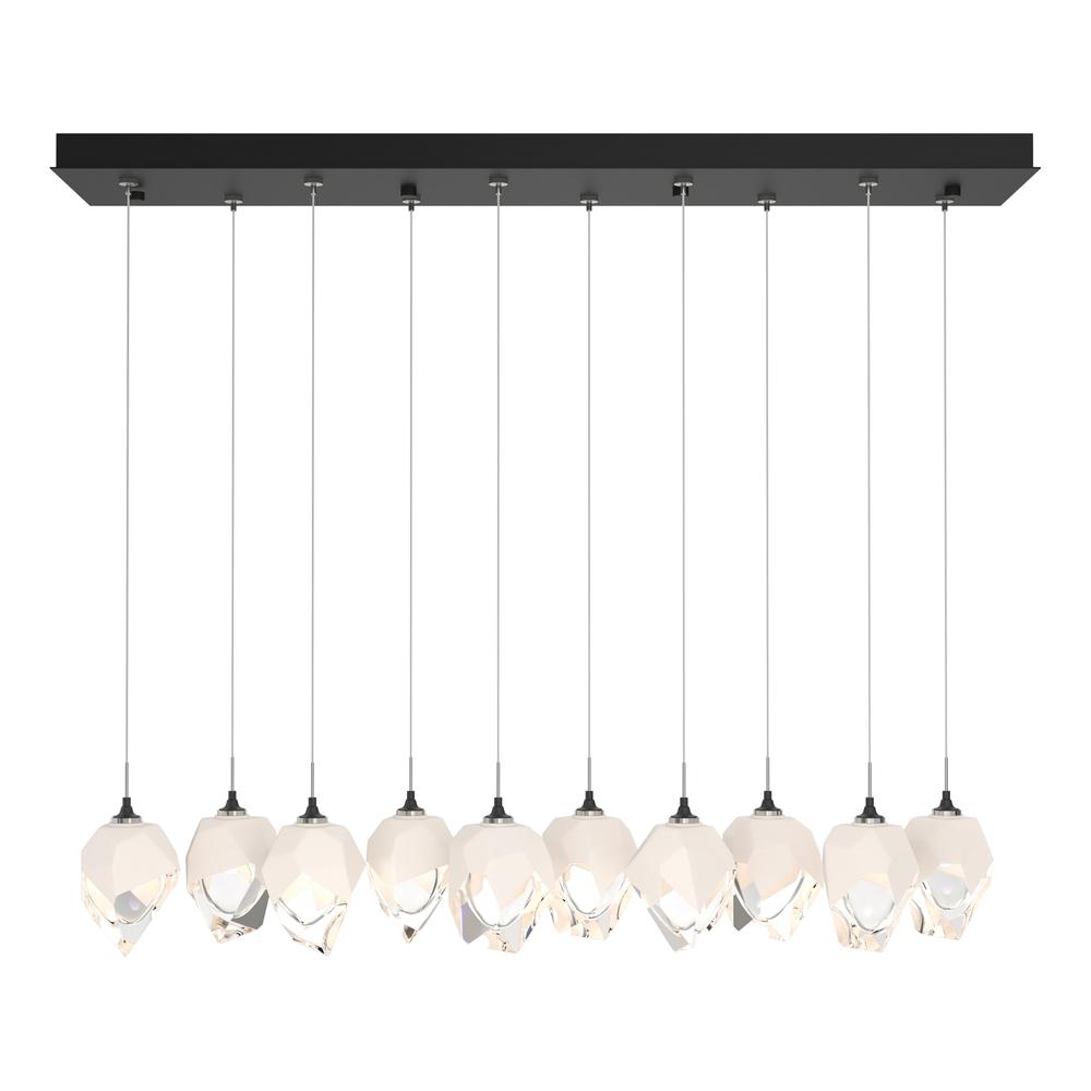 The Chrysalis 10-Light Small Crystal Pendant is a multi-port fixture that features ten small, handcrafted faceted glass crystals suspended from a rectangular canopy. A thick, clear layer of glass is encased in an outer cocoon of hand-blown, colored glass (matte black or white; all 10 are same color). Hand-polished like a gemstone, the lower portion of the outer layer of glass is removed to reveal the inner crystal clear layer below. Each crystal is lit from within.