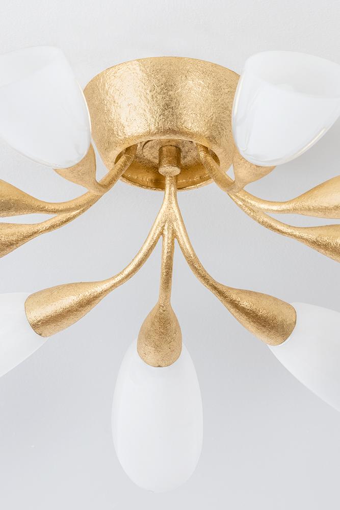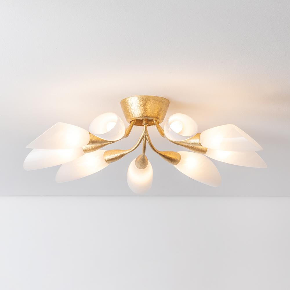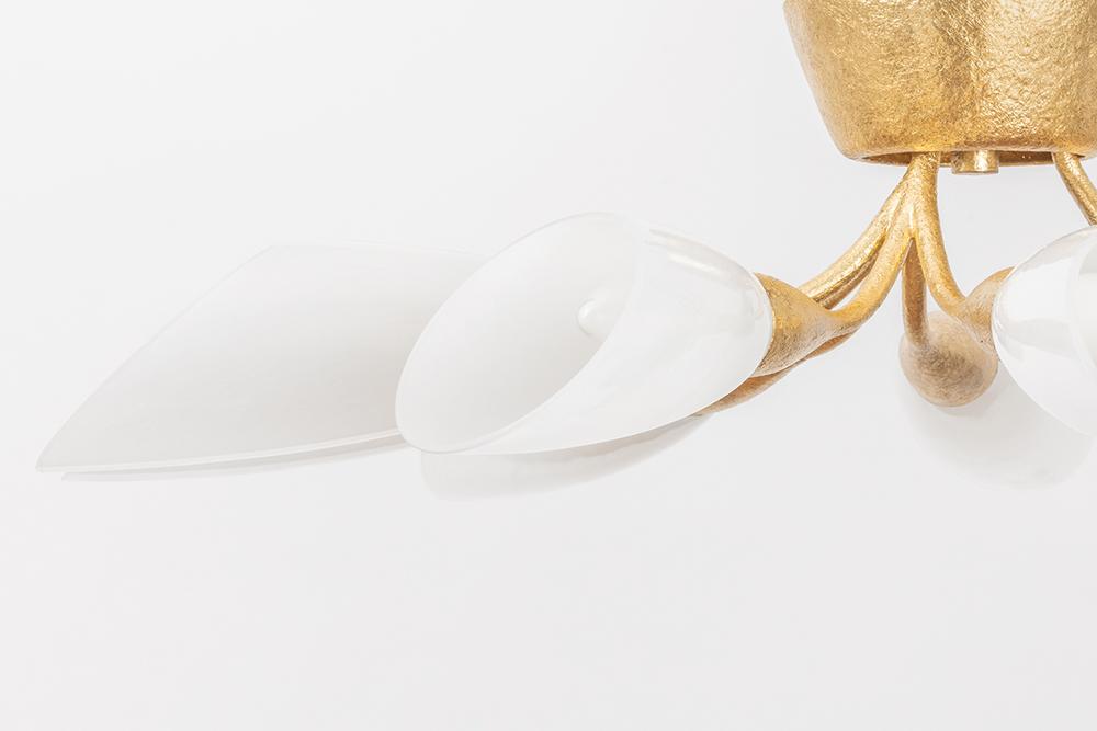 The botanical silhouette of Enfield features a sleek branching profile in scaled-up proportions. Cloud glass shades inspired by floral blooms offer a soft, contemporary feel with bias-cut ends that direct light upwards. The elongated, slender ‘stems’ embody a modern aesthetic, enhanced by the luxurious Vintage Gold Leaf finish.