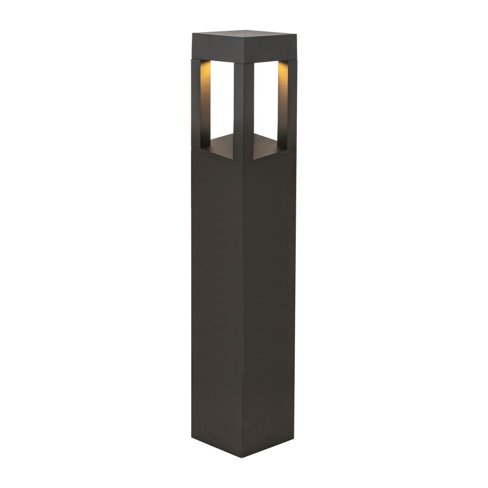 Architectural designed high powered LED exterior bollard fixture, high pressure die-cast aluminum square-shaped housing with four rectangular-shaped openings which radiates the light downward and throughout all openings and surrounding areas of the bollard. Available in two different heights and IK10 Rated.