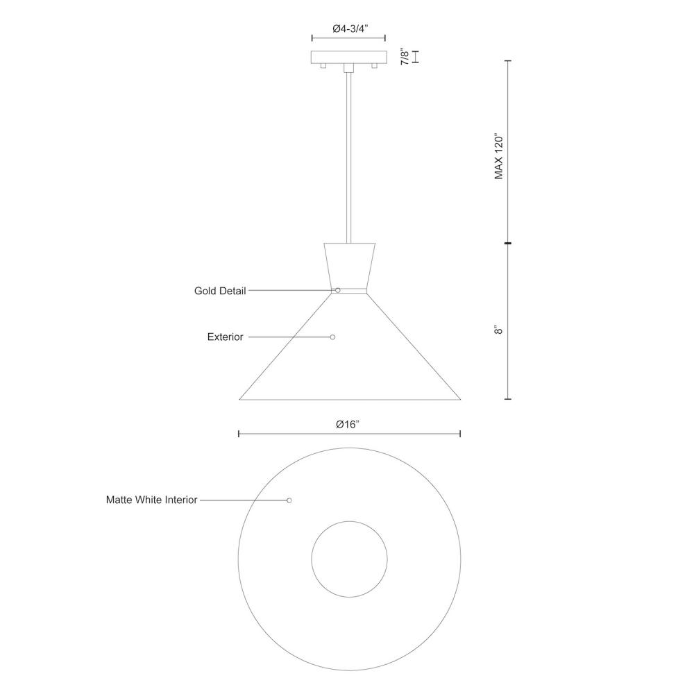 Single-lamp pendant with conical aluminum shade with fine powder-coated finishes and anodized gold ring detail. Exterior shade colors are white or black, with matte white interior. Suspended by cloth cable