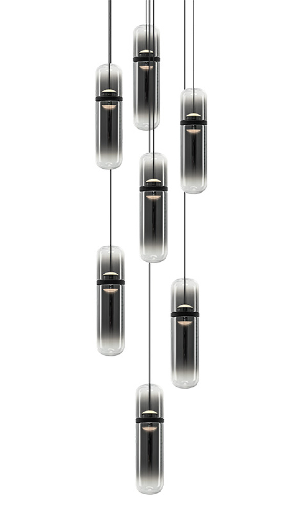 Amulet Sleek sophistication meets sculptural luminosity in this modern pendant series. Each elongated glass capsule features a softly tinted center that transitions to clear glass at the top and bottom, creating a refined gradient effect and warm, atmospheric glow. The Champagne Gold finish pairs with amber-tinted glass, while the Matte Black finish pairs with smoked-tinted glass, each offering a distinct and contemporary expression. Suspended from a coordinating canopy, the pendants float gracefully, adding movement and visual interest to any space. Features a 5CCT switch inside the canopy to adjust the 5 selectable colour temperature