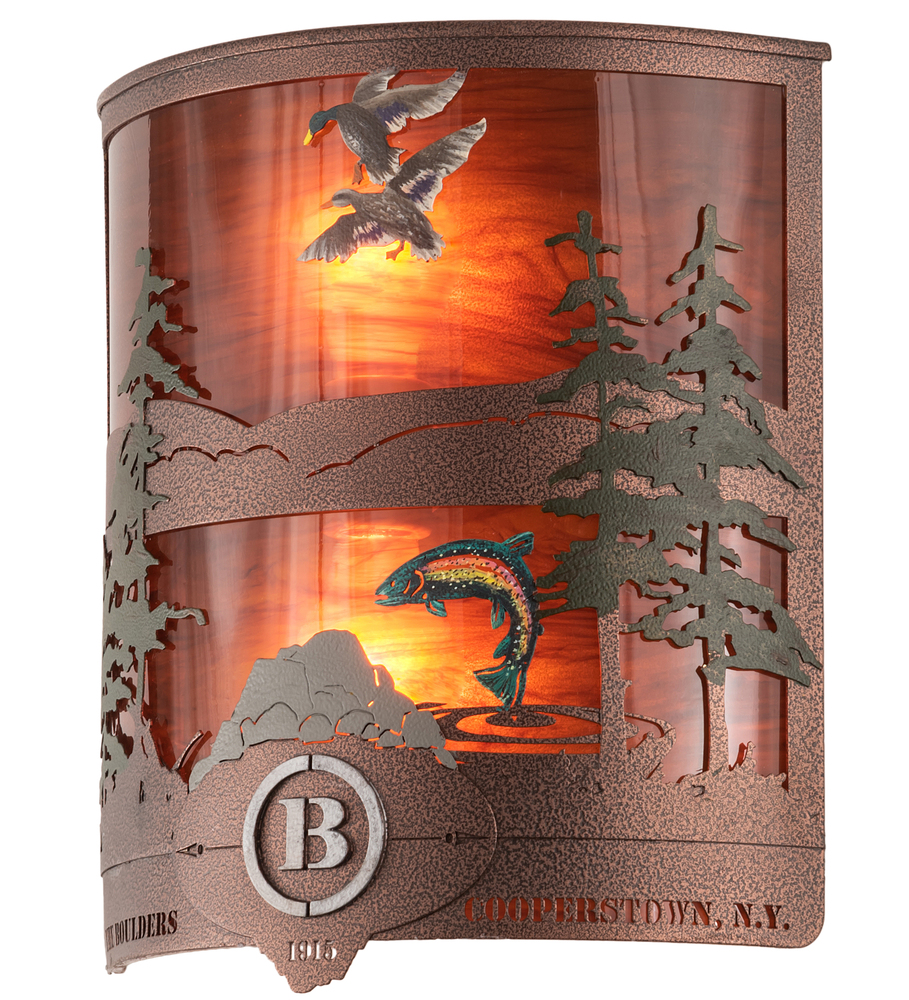 Perfect for indoor/outdoor applications. This Wildlife styled wall sconce features Custom Hand-painted Ducks in Flight; Tall Pine Trees and Leaping Trout. The shade highlights a Maduro Idalight background complemented with Brass hardware in New Copper Vein powder coat. This ADA sconce is personalized with the laser-cut The Boulders Cooperstown; NY name and Black hand-painted logo. Handcrafted in our 180;000 square foot manufacturing facility in Yorkville; NY at the foothills of the Adirondack Mountains. UL and cUL listed for dry; damp and wet locations. This personalized item is an example of our craftsmanship and custom capabilities. It is not for sale as is but can be customized with a business or family name to fit your personal needs.