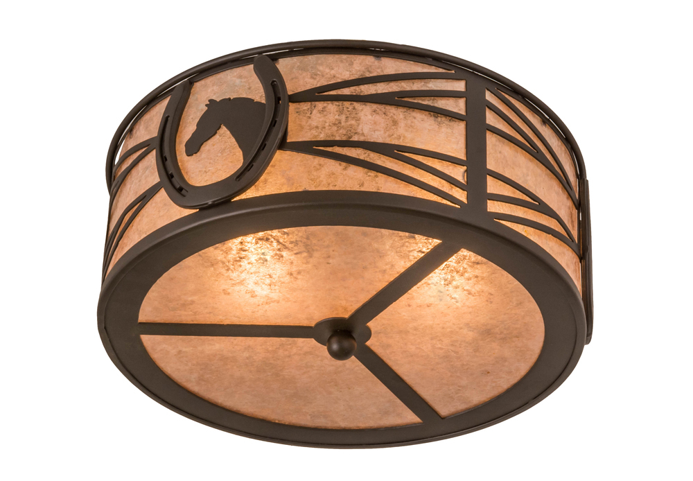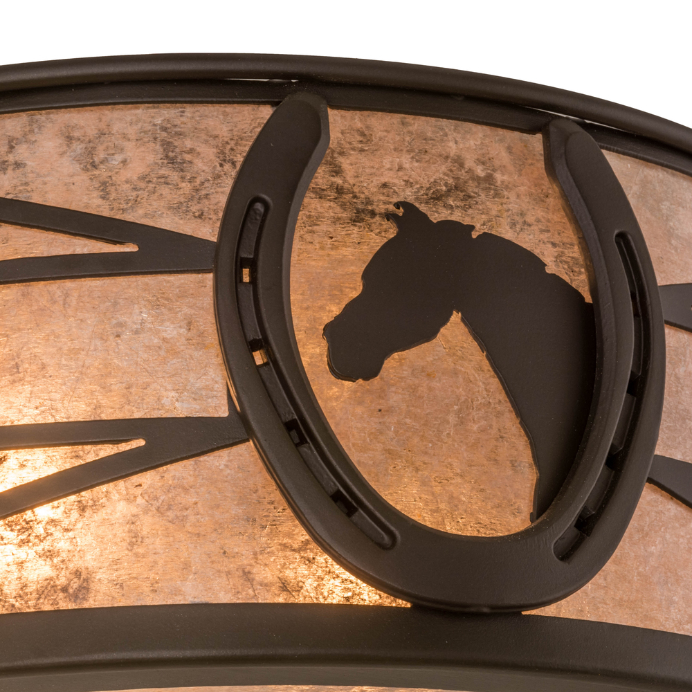 A horse portrait framed with a lucky horseshoe encircles this handsome ceiling fixture. Beautiful ambient light projects through stunning Silver Mica accented by a geometric design styled after fencing commonly found at horse stables. Decorative hardware; frame and accents are enhanced in an Oil Rubbed Bronze finish. Perfect for game rooms; man caves and equestrian centers; as well as other residential and commercial spaces. Handcrafted by highly skilled artisans in the USA. Custom sizes; styles and colors are available. Energy efficient lamping options such as LED are offered. This fixture is UL and cUL listed for damp and dry locations.
