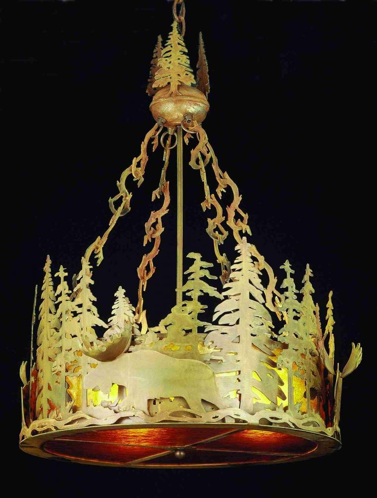A Moose wanders through the tall pines around this circular pendant handcrafted in the USA by Meyda artisans. Suspended from hand crafted branch like chain links that hang from a pine tree adorned hub; this fixture is finished in Rust and has Amber Mica panels.