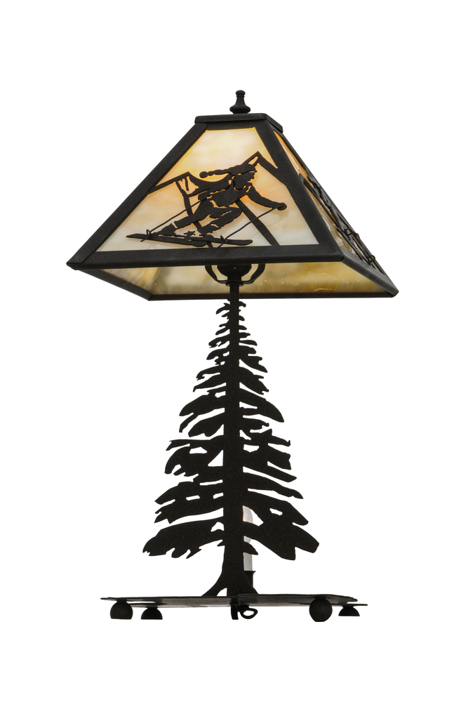 A winter skier slaloms down the slopes during an epic skiing event with a mountain range in the background. Warm ambient lighting is diffused beautifully through Beige Iridescent glass enhanced by a frame and Pine tree base featured in a Dark Roast finish. This lamp is ideal for nightstands; occasional tables and desks. Handcrafted in the Meyda manufacturing facility; located at the foothills of the Adirondack Mountains; not far from Lake Placid; home of the 1980 Winter Olympics. Custom designs available; as well as energy efficient lamping.