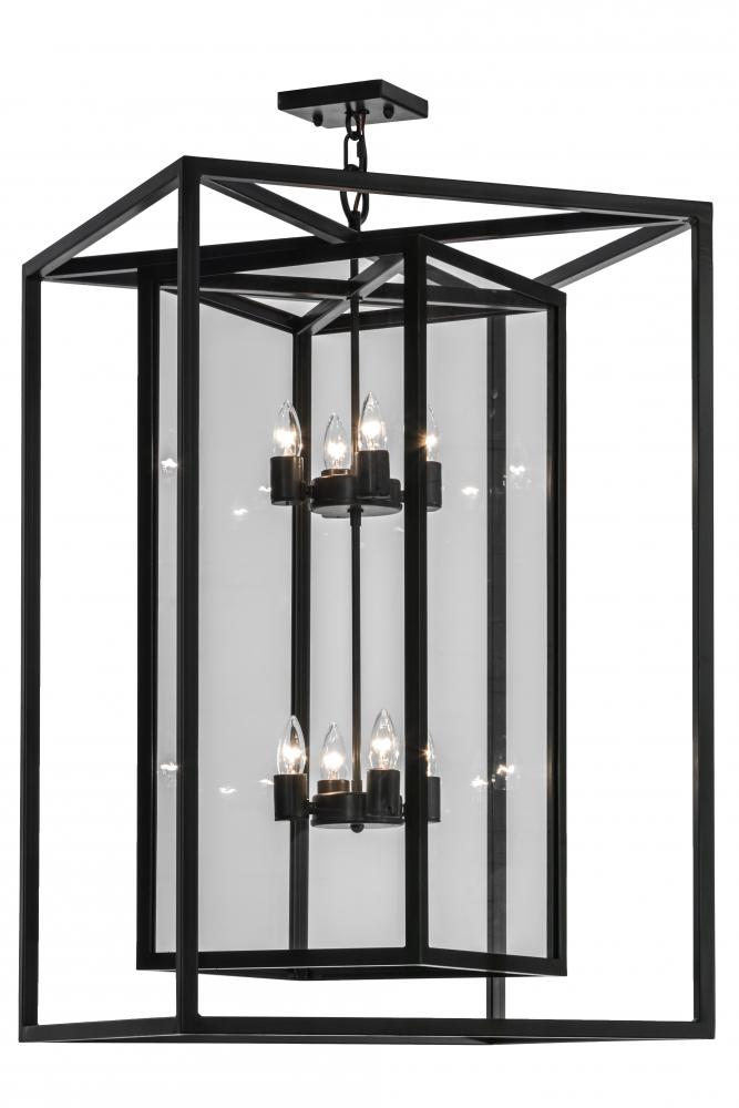 A modern; architecturally styled fixture is designed with a pizazz that is unique; fresh and stylish. Give your decor an extra edge with this innovative fixture featuring a Clear glass box within a larger Solid Steel cage. Suspended inside the cage are eight faux candlelights. The elaborate frame and hardware are finished in Timeless Bronze. Handmade in our 180;000 square foot manufacturing facility in Yorkville; New York.