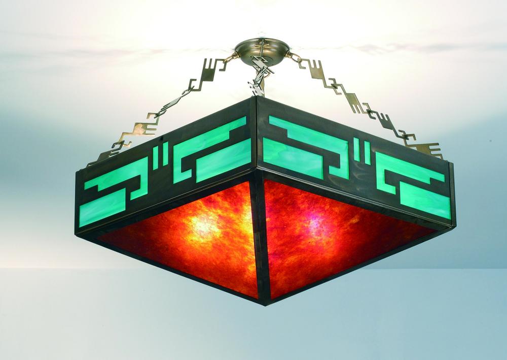 A handsome Southwestern design features a dramatic geometric pattern that arouses curiosity and intrigue on this ceiling fixture.Turquoise art glass crowns a stunning Amber Mica diffuser; which is enhanced with Antique Copper finished hardware; accents and frame.Made in the USA; this fixture is handcrafted by Meyda artisans in our Yorkville; New York manufacturing facility. Custom colors; sizes and styles are available. Energy efficient lamping options are offered.The fixture is UL and cUL listed for dry and damp locations.