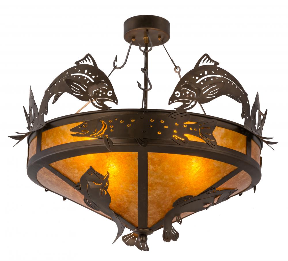Fish are jumping and swimming about in this striking lighting design; a fisherman's dream. Aptly named Catch of the Day; this American-made fixture captures Trout; Bass; and Pike handcrafted in an Antique Copper finish while adorning an Amber Mica shade. The chandelier is suspended with an interlocking fishhook chain from a hub above. The pendant is custom crafted by Meyda artisans at the foothills of the majestic Adirondack Mountain lakes; in New York state. Custom lighting designs; colors and sizes are available; as well as dimmable energy efficient lamping options.