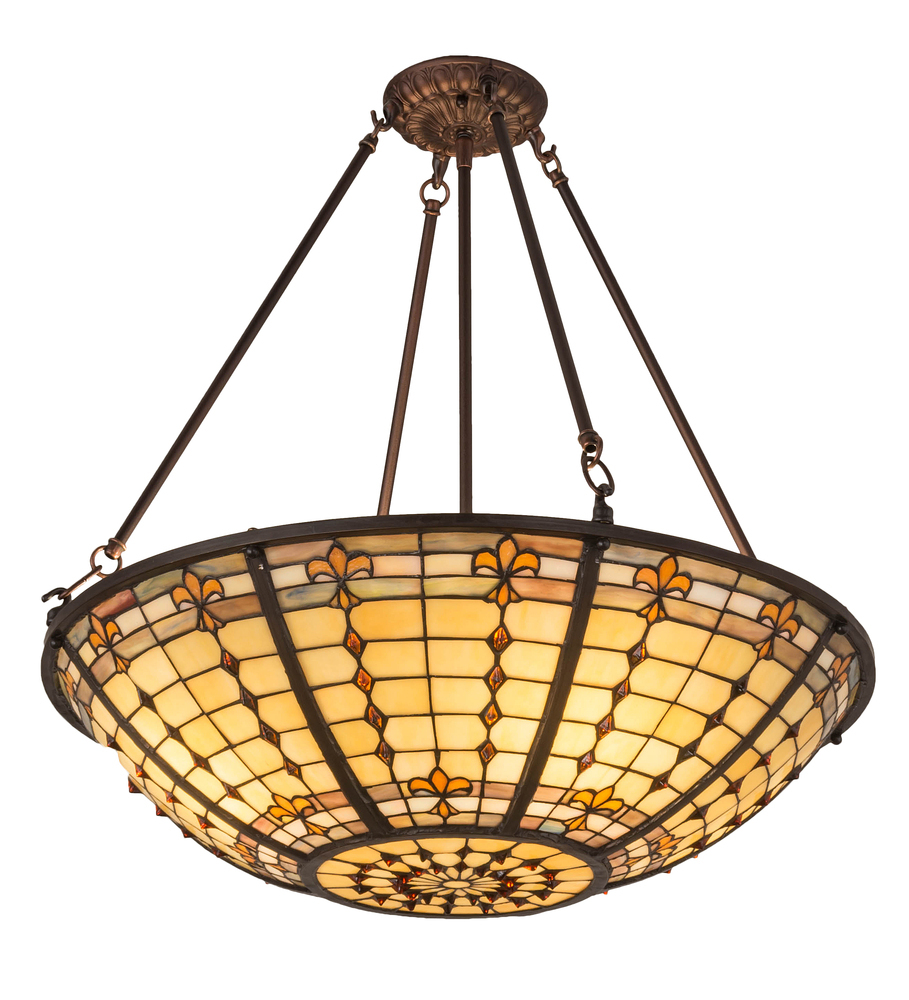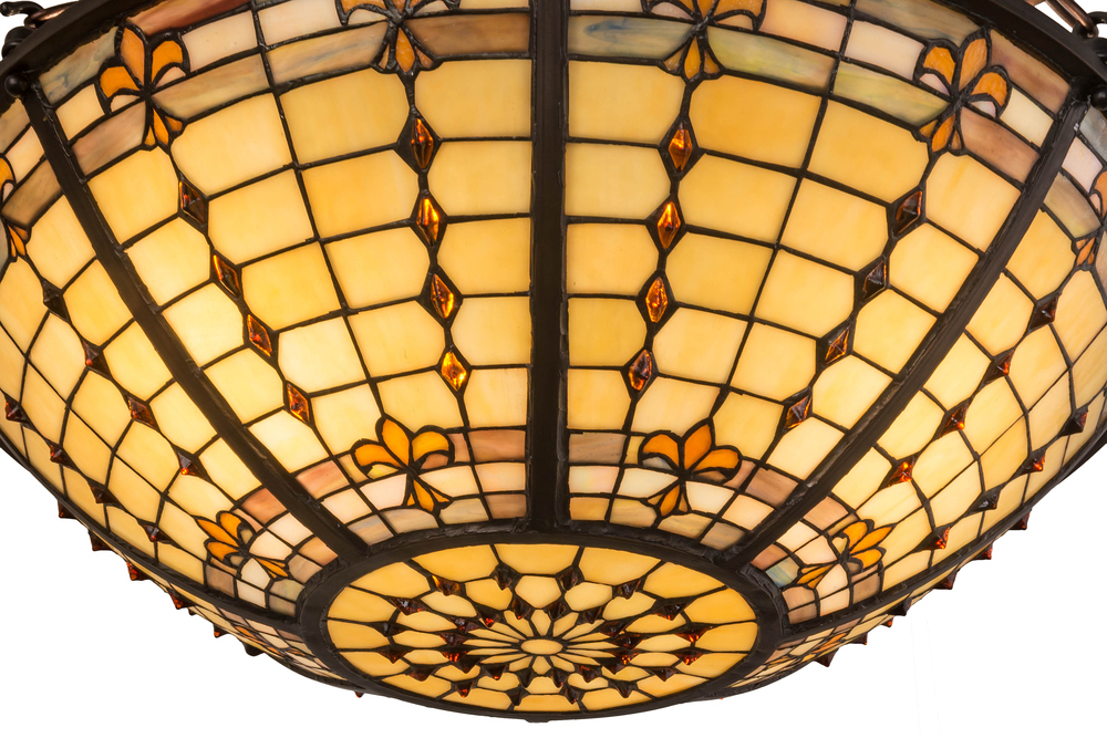 A Meyda Tiffany original design; the round Fleur-de-Lite fixture is an elegant design of Amber colored stylized three-petaled Lilies with complementary colored jewels. A stately hand crafted frame cradles the stained glass shade which is reminiscent of castle and cathedral glass. This fixture is finished in Mahogany Bronze and the shade is crafted using the famous copperfoil construction. Available in custom colors; designs; sizes and dimmable energy efficient lamping; this fixture is UL and cUL listed for damp and dry locations.