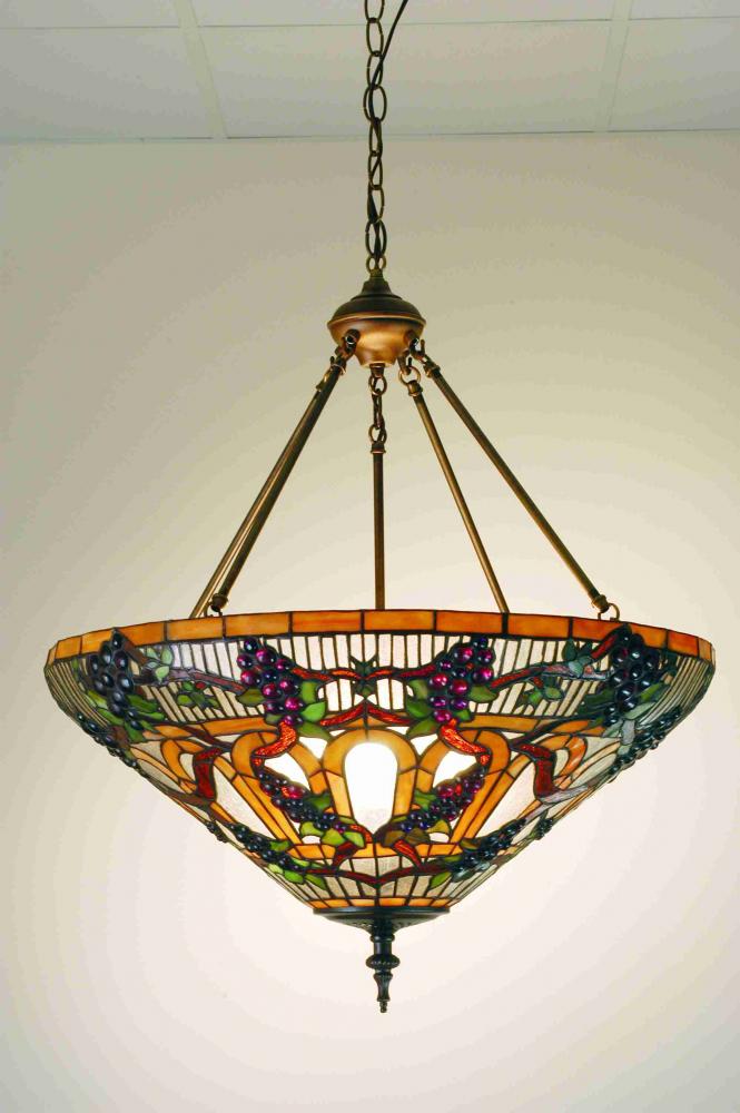 Radiant Concord Purple jewels; Vineyard Green leaves and glistening dew kissed Bark Brown vines wrap around a Golden Sunshine banded stained glass shade. Bring sunny vineyards to your own home with this lovely Meyda Tiffany original inverted pendant. The coordinating hardware is finished in a warm Mahogany Bronze.