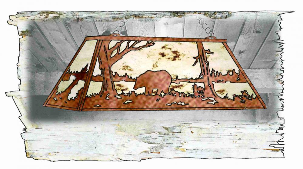 Drawing inspiration from the wildlife and natural beauty in the nearby Adirondack Mountains; this stunning lighting fixture depicts a majestic Bear wandering near the woodland lakes as the morning sun rises in the background. A warm ambient glow projects through Silver Mica; which is complemented with a frame and hardware featured in an Antique Copper finish. The pendant; which is perfect for illuminating islands; counters and billiard tables; is handcrafted by Meyda artisans in our Yorkville; NY facility.This image is an artist rendition and the actual fixture will deviate from the illustration shown. Please feel free to request drawings for customized designs as sizes; styles; finishes and dimmable energy efficient lamping options can be made to order.