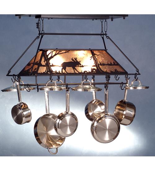 Pot Racks can be made in any size- 40 or 60 inches; you name it. Do you want the shade in Amber Mica or Sunburst Art Glass sky with Crystal Blue Lake? We can do it. Show several Moose with Pine Trees; we will make it. May we suggest a metal finish like contemporary Brushed Nickel or classic Antique Copper? For high ceilings; suspension chain adjusts to meet your needs. We can add hooks for extra cookware. Tired of replacing bulbs; we can install LEDs that last 50;000 hours. Add functional downlights to shed light on counters. Add continuity to decor with matching sconces; pendants; fireplace screens; and outdoor lighting. Handcrafted in Upstate New York. Shown is the 40-inch Moose Pot Rack with Silver Mica diffuser and Textured Black finish.