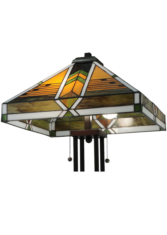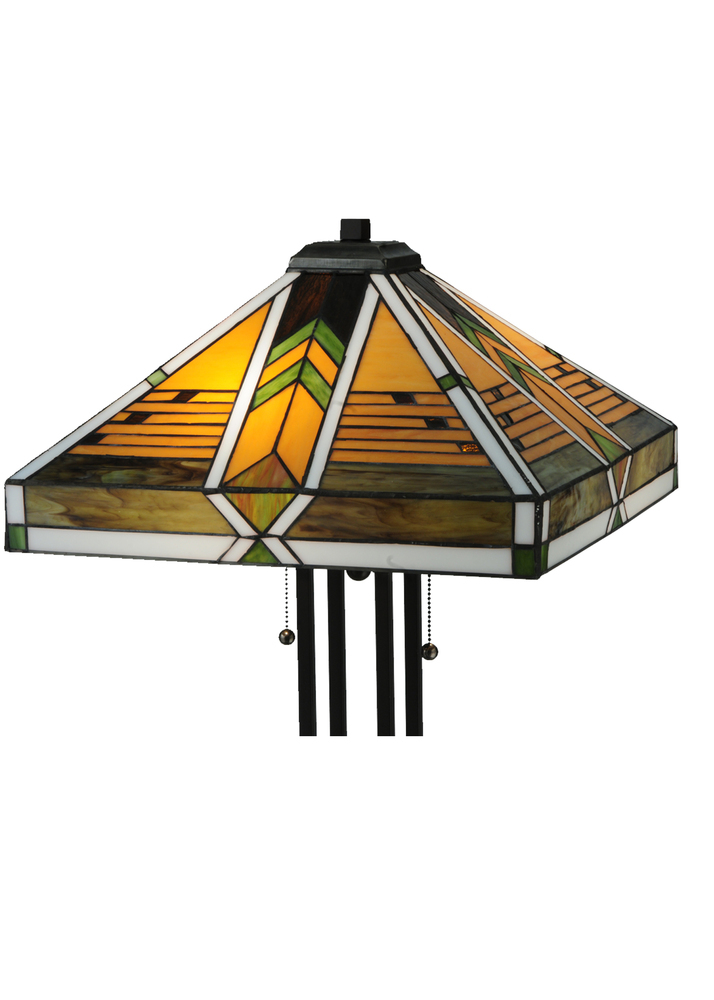 Offering a unique and handsome Mission design; Abilene uses colorful arrowheads of Honey; Woodsy Green and Bark Brown on a multi-designed motif of linear locks of Green; Bark Brown and Amber. The handcrafted stained glass shades; which feature a Mission design that interprets organic objects into geometric forms; are framed in White with Woodsy Green glass and was created using Meyda Tiffany's famous copperfoil construction process. The shade is complemented with Mahogany Bronze finished four-column base.