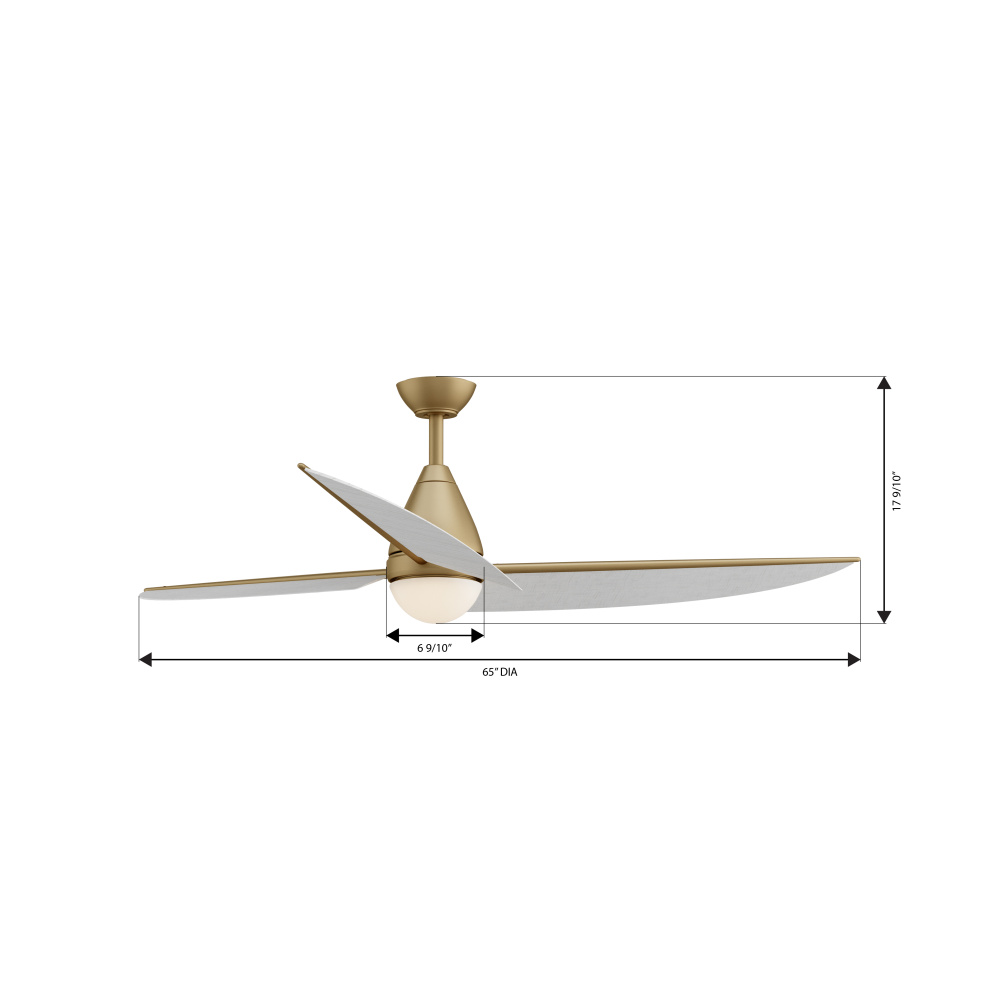 This ceiling fan measures 65"L x 65"W x 18"H with a 65" blade sweep.