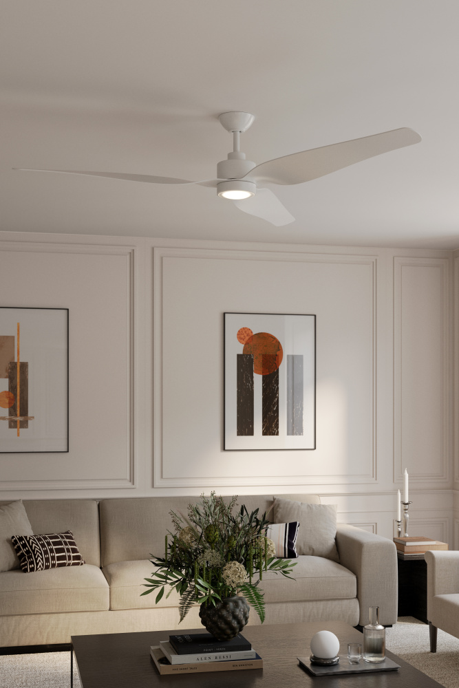 Featuring a Flat White finish with Flat White blades and Etched shade.