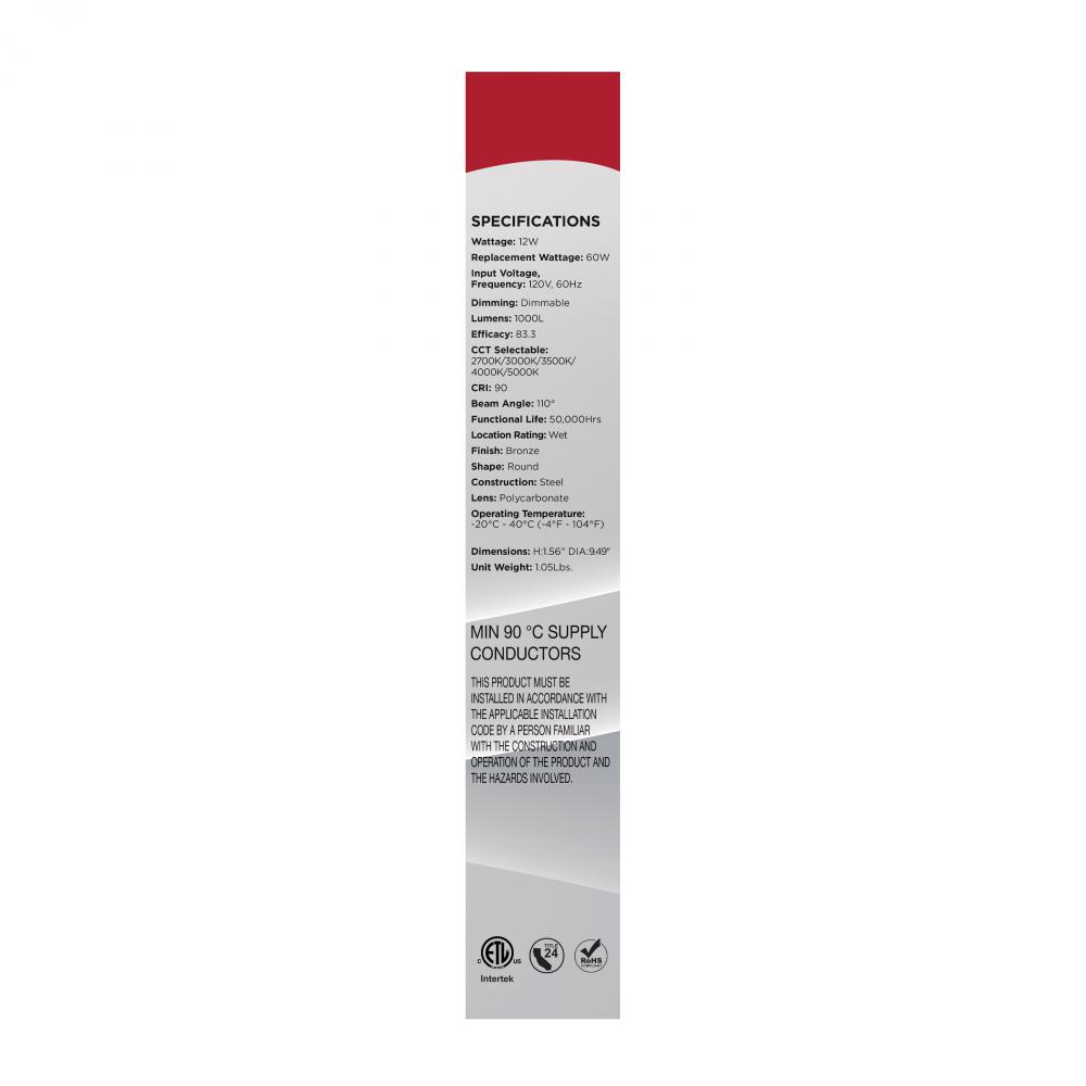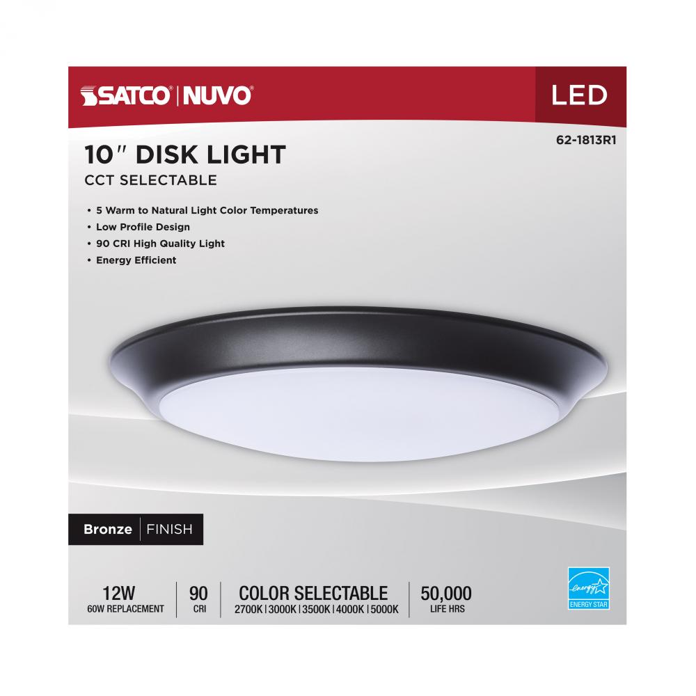 Designed for larger spaces, SATCO NUVO's 62-1813R1, 10" CCT Selectable Disk Light in a bronze finish delivers powerful, customizable illumination with a sleek, low-profile look. Consuming just 12 watts, this high-performance fixture features five s