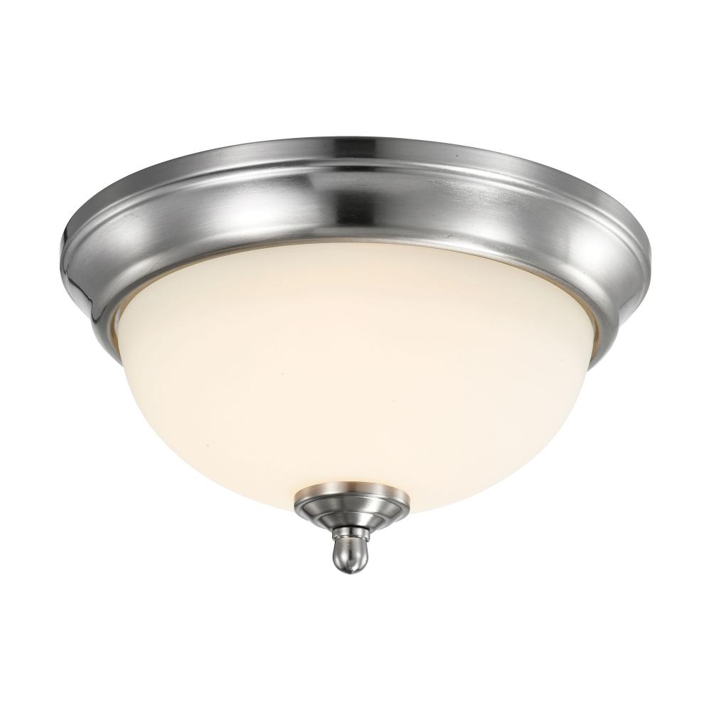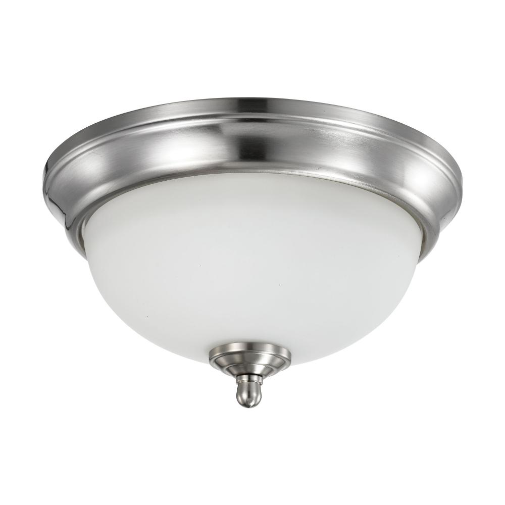 Satco's 62-1562 19-watt, 11 inch flush mount fixture is a clean and traditional lighting solution for the home. The brushed nickel finish and frosted glass are in keeping with the versatile, yet stylish design. Ideal for lighting areas with low ceiling