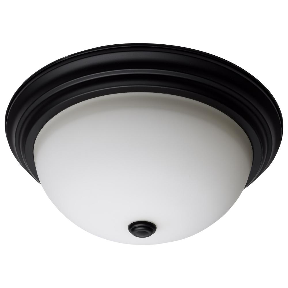 SATCO NUVO's transitional fixtures deliver on high quality and functionality. Stylish in a matte black finish with a glass center lock white opal lens, they are offered in 11, 13, or 15 inch diameters. Accepting standard A19 medium base lamps (not incl