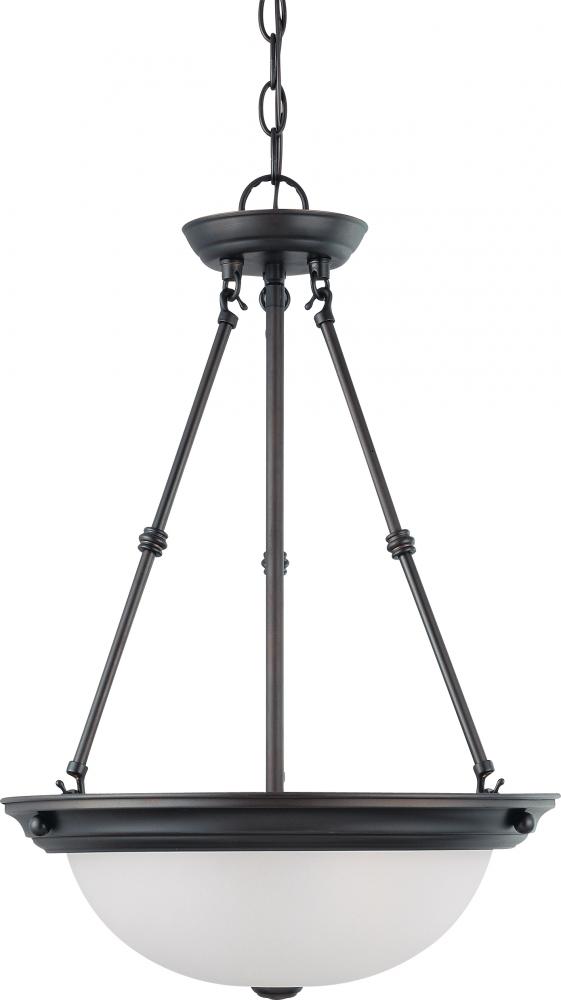 Satco's 60-3152 3 light, 15 inch pendant fixture features a deep rich mahogany bronze finish, accented by frosted white glass. Illuminate living rooms, dining rooms, and foyers with this elegant pendant. Traditional, yet contemporary, this 3 light pend