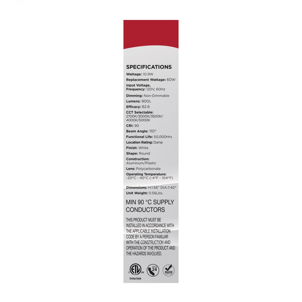 SATCO NUVO's 7-inch white CCT Selectable Disk Light, #62-1820R1, delivers efficiency, convenience, and modern performance in a compact form. With five selectable color temperatures (2700K/3000K/3500K/4000K/5000K), this fixture easily adapts to a wide r