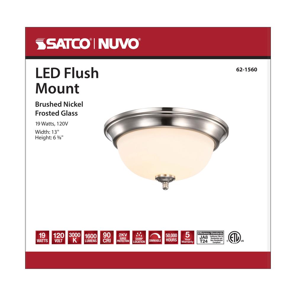 SATCO NUVO'S 62-1560 LED 19 watt, 13-inch flush mount offers the perfect blend of integrated LED technology and utility-style lighting. This simple flush mount illuminates a dark stairwell, hallway or laundry room to name a few applications. The froste
