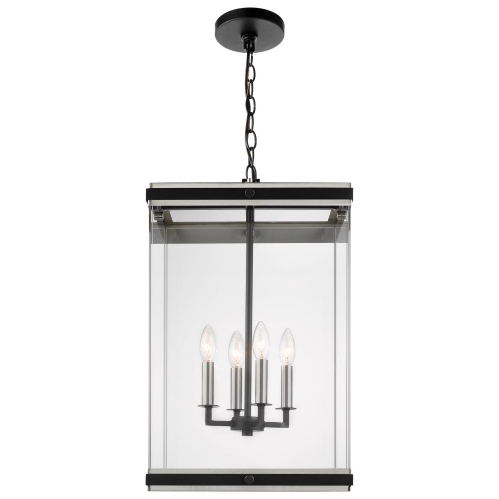 A combination of glass and metal comes together to create the stunning design of the Crossroad foyer pendant. The square, clear glass panels showcase the bulbs. The sockets and base are finished in brushed nickel to contrast beautifully with the matte blac