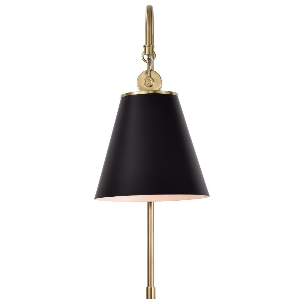With subtle detailing, the Dover wall sconce is graceful yet unassuming. The simple black shade features a white lining to reflect the light, and the trim is finished in vintage brass to match the fixture's body. Place in a dining room for ambiance, or