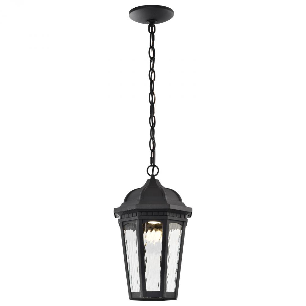East River LED 8.25-inch outdoor hanging lantern finished in matte black with clear water glass, Smart Starfish enabled, featuring Color and White tunable CCT Selectable
