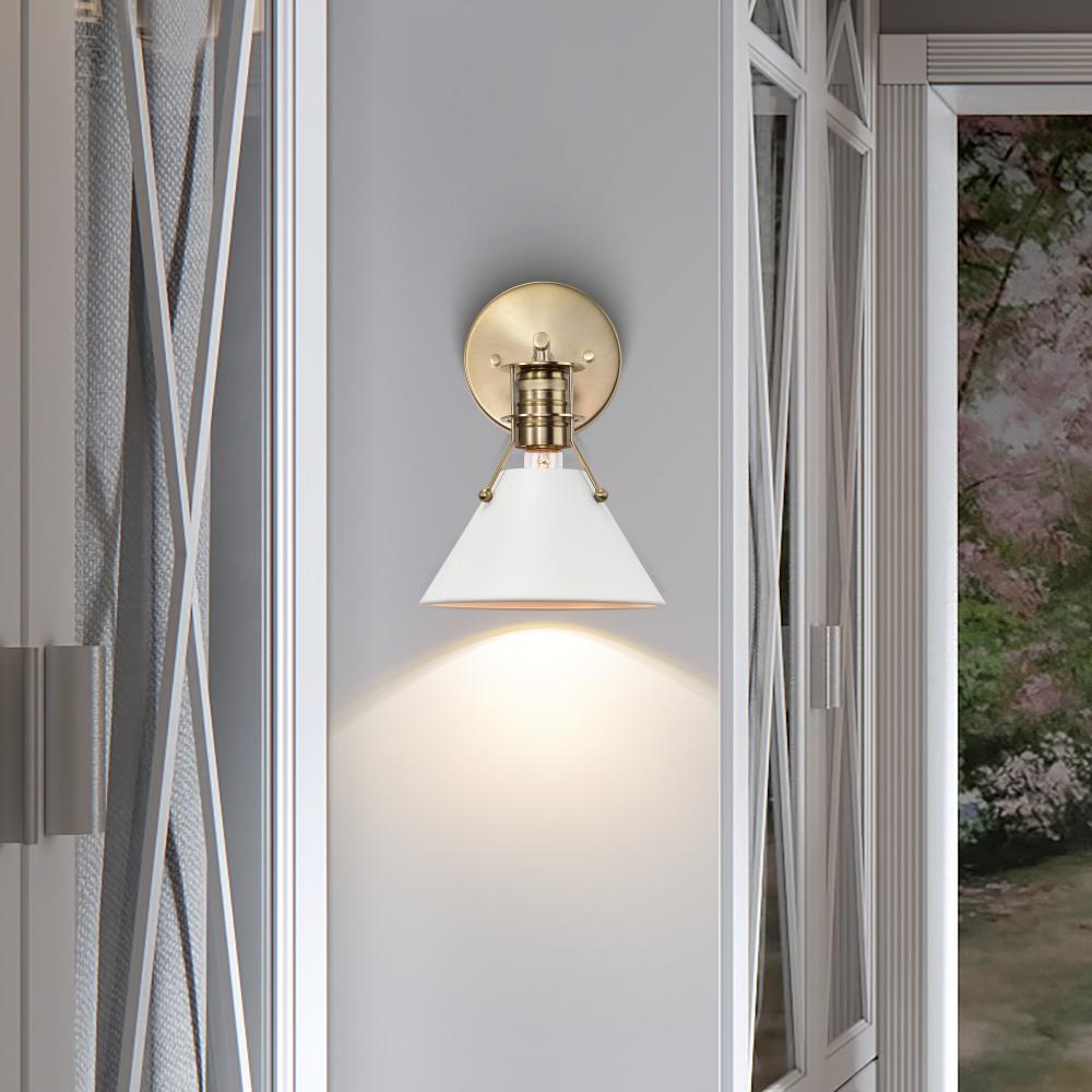 Open, airy and full of charm, the Outpost wall sconce features unique style that is all it is own. The cone shade suspends with slim rods showcasing the exposed decorative burnished brass socket and a slight peek of the vintage bulb. The matte white finish