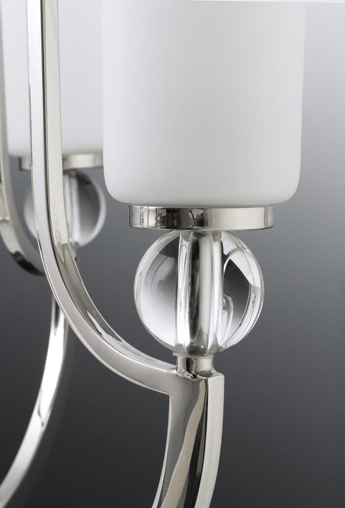 Traditional Classic And Modern Form.;Tall, Trumpeted Opal Glass.;K9 Glass Orb Accents And Polished Nickel Finish.;Includes One 6", Four 12" Stems And 6 Links Of Chain.