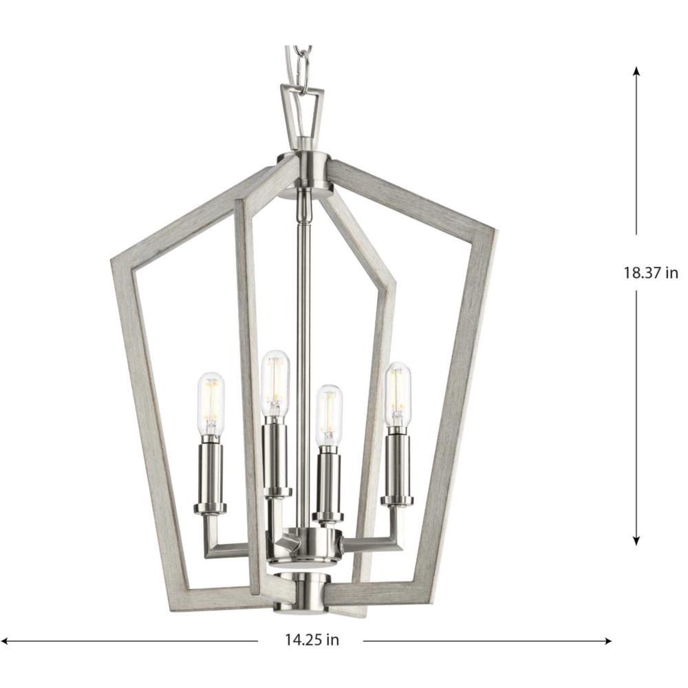 Clean, modern lines combine with rustic elements in the Galloway Collection. A lightly distressed grey washed oak finish highlights an open, angular frame suspended from an adjustable chain and simple round canopy, all finished in subtle brushed nickel. Brushed nickel columns hold candelabra lights that glow brightly within the stately form to illuminate spaces in a casually elegant style. The foyer light's airy design beautifully illuminates hallways, foyers, kitchens and breakfast nooks.