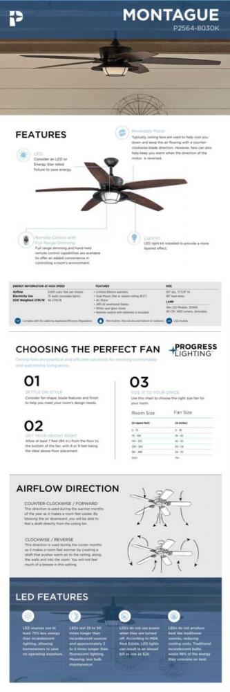 60" Montague indoor/outdoor ceiling fan features a spacious design with five blades;The white opal glass shade contains a 18W dimmable, 3000K LED module, 90+ CRI and 1400 lumens (source) - offering both form and function with energy- and cost-savings b