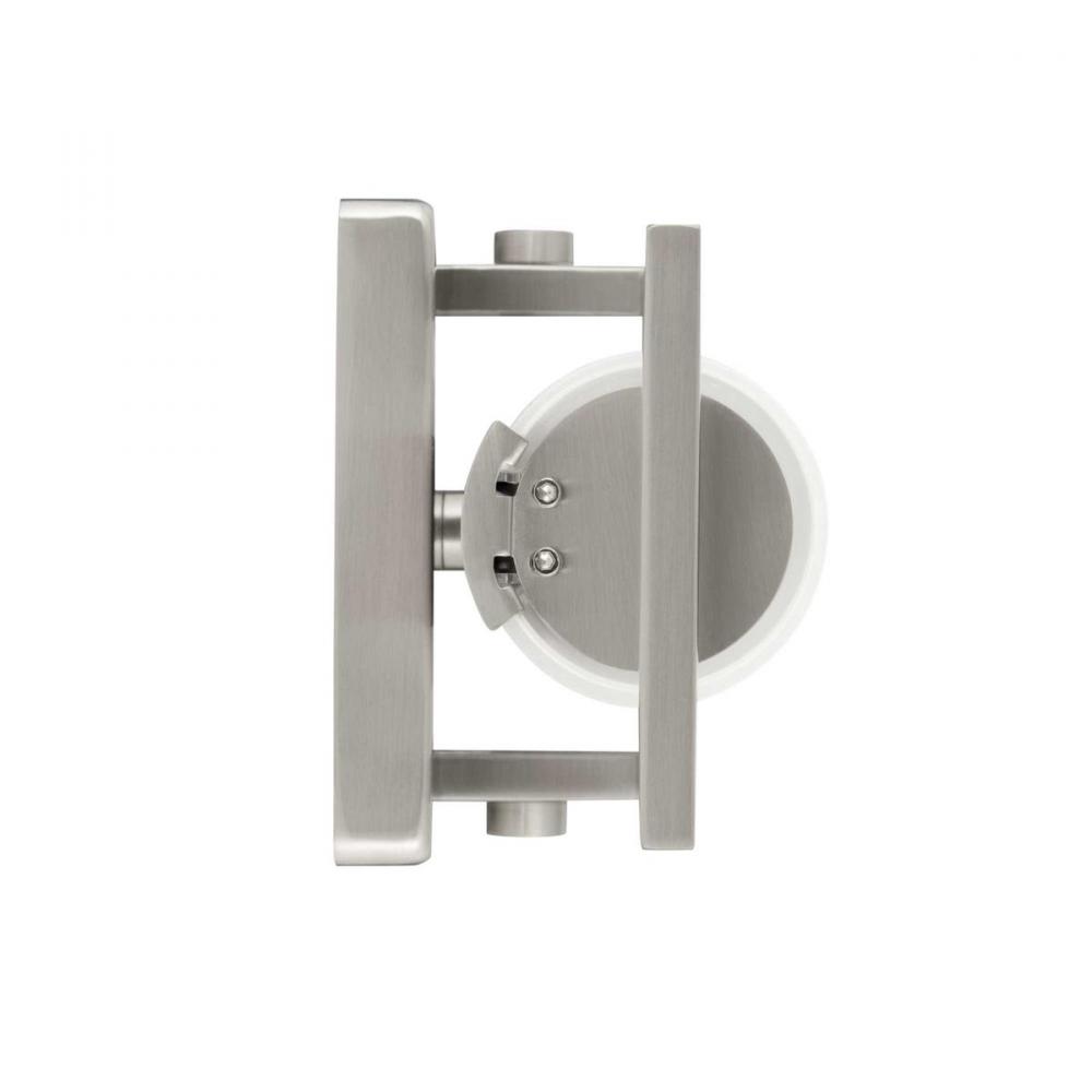 Modern architectural styling frames with an integrated LED source and circular etched opal glass. For increased design options, fixtures can be installed horizontally or vertically. Frame 24" bath and vanity fixture provides beautiful and continuous illumination, as well as energy saving benefits. 3000K, 90+ CRI. Complimented by a Brushed Nickel finish.