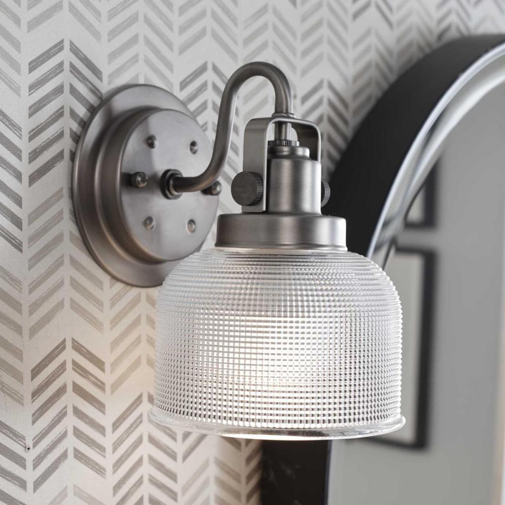Ideal for a bathroom, hallway, or foyer;Perfect for coastal, farmhouse, transitional, and vintage electric style settings;Beautiful antique nickel finish;Stunning clear double prismatic glass shade;Mount the light fixture facing up or down;Use 1 medium bas