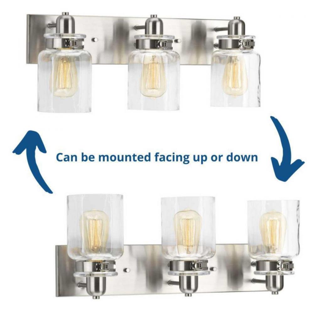 Ideal for a bathroom;Perfect for farmhouse and urban industrial style settings;Beautiful brushed nickel finish;Crisp clear glass shades;Mount the light fixture facing up or down;Use 3 medium base bulbs that are sold separately (100 W max - LED/CFL/incandes