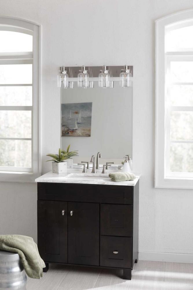 A delightful trend in home decor is the repurposing of antique parts into new, functional furniture and accessories. The Calhoun Collection playfully follows this lead with an apothecary style and features a clear glass diffuser held in place with a mechanical latch from a spice container. The glass shade showcases a thickened profile to create a vintage-style surface for a classic handmade appearance. Four-Light bath & vanity with a Brushed Nickel finish.