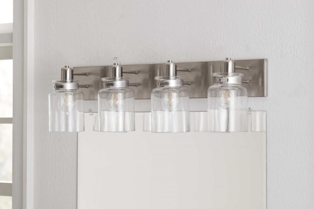 brushed nickel;fourlight bath;grey;incandescent;bath vanity;traditional;casual;modern farmhouse;bath light;bath vanity light;bathroom light;bathroom wall light;bath wall light;bath bracket;bath wall bracket