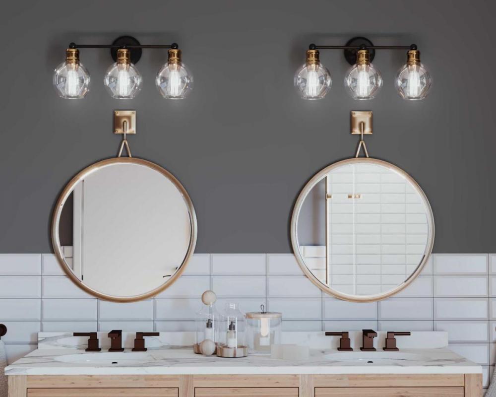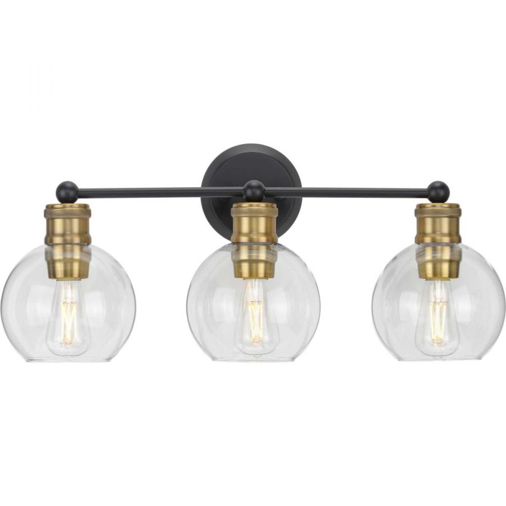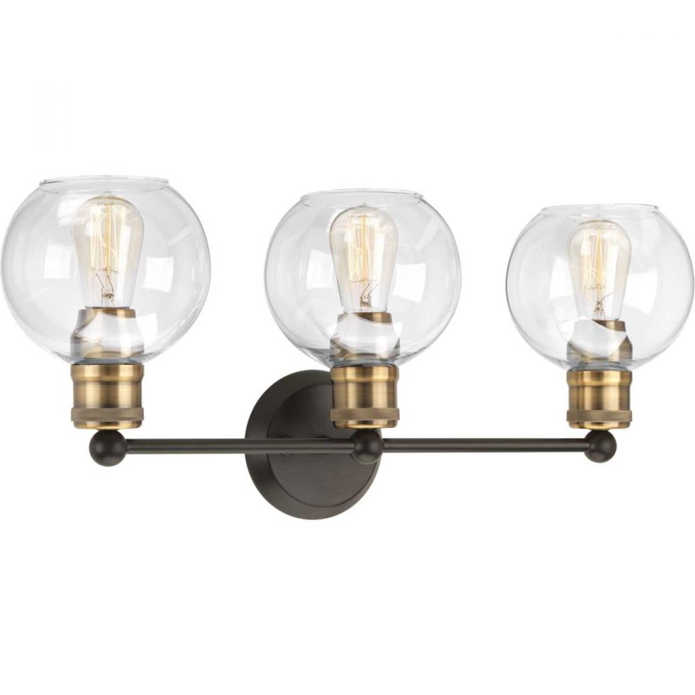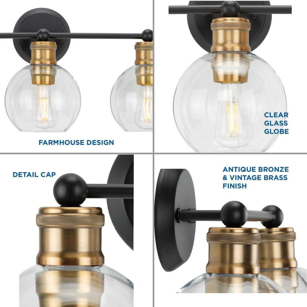 The Hansford collection of fixtures feature a clear, spherical shade paired with vintage style metal fittings in an Antique Bronze and Vintage Brass combination finish. Featuring a clean and precise design with generous scale, Hansford's classic style brings tranquility to your home with. Hansford lends itself to Farmhouse, Coastal or Industrial interiors. Can be used with clear or vintage bulbs for a variety of looks. The three-light bath & vanity fixture can be mounted up or down.