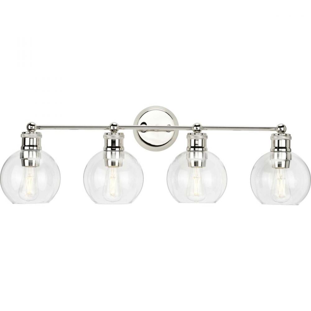 Ideal for a bathroom;Perfect for coastal, farmhouse, and vintage electric style settings;Subtle polished nickel finish;Crisp clear glass shades;Mount the light fixture facing up or down;Use 4 medium base bulbs that are sold separately (100 W max - LED/CFL/