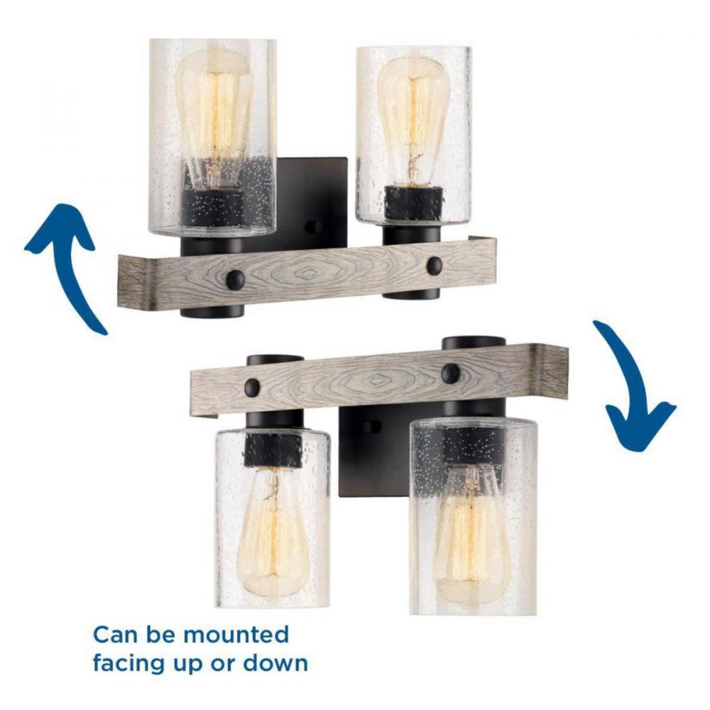 Ideal for a bathroom and powder room.;Perfect for coastal, farmhouse, rustic, and urban industrial style settings;Gorgeous graphite finish with faux painted weathered driftwood accents;Rustic clear seeded glass shades;Mount the light fixture facing up or d