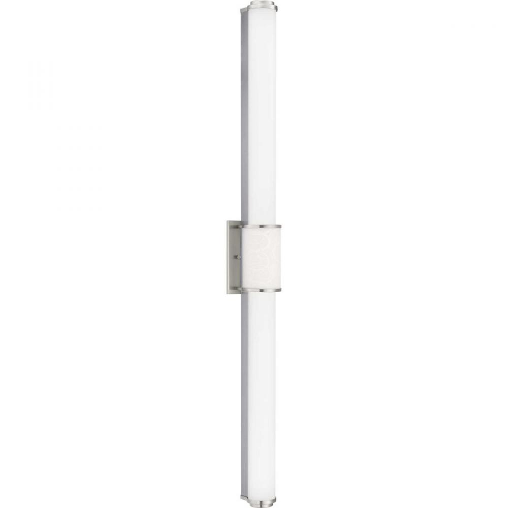 Ideal for a bathroom;Perfect for modern style settings;Beautiful brushed nickel finish;Crisp white acrylic shade;Fixture can mount horizontal and vertical;Includes 1 integrated LED (42 W), 3400 lumens, 3000 K, 90 CRI, dimmable;Measures 48-inch width by 4.