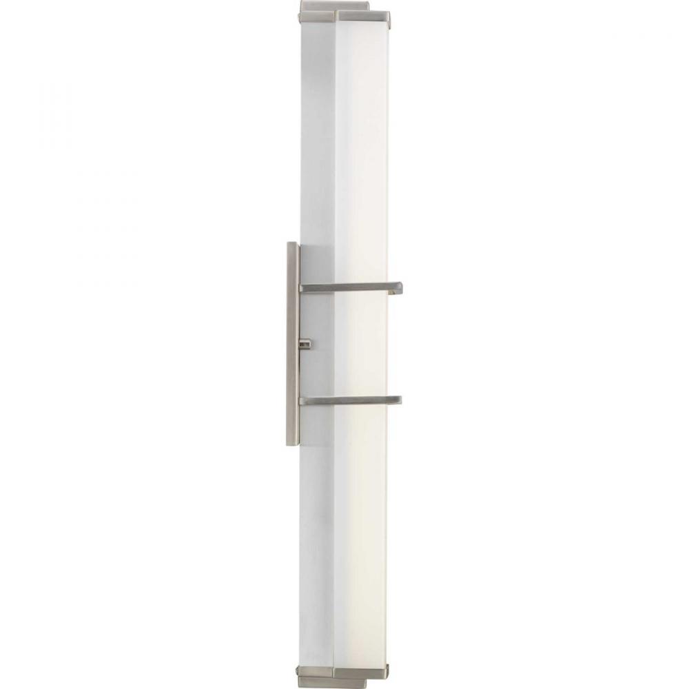 Ideal for a bathroom;Perfect for modern style settings;Beautiful brushed nickel finish;Crisp white acrylic shade;Fixture can mount horizontal and vertical;Includes 1 integrated LED (23 W), 1550 lumens, 3000 K, 90 CRI, dimmable;Measures 24-inch width by 4.