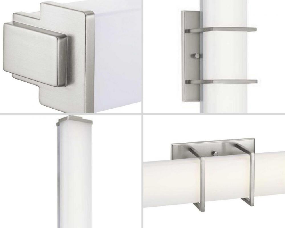 Phase 2.2 features a thin, acrylic shade framed by architectural accents in Brushed Nickel complete the design. This specially designed 48in. linear bath fixture delivers ambient light to surfaces free of shadows. Ideal for residential, commercial and multi-family applications. An integrated LED source provides energy and cost savings benefits. Can be installed vertically or horizontally.