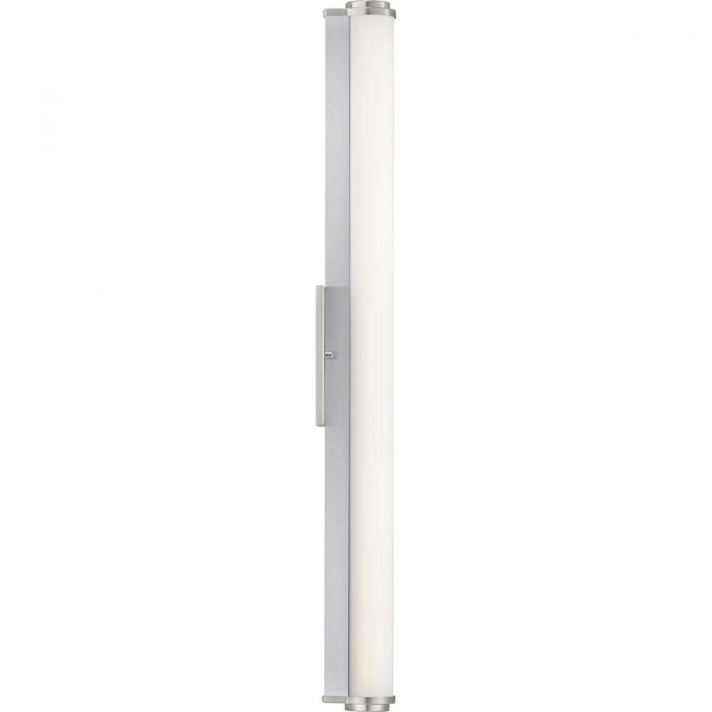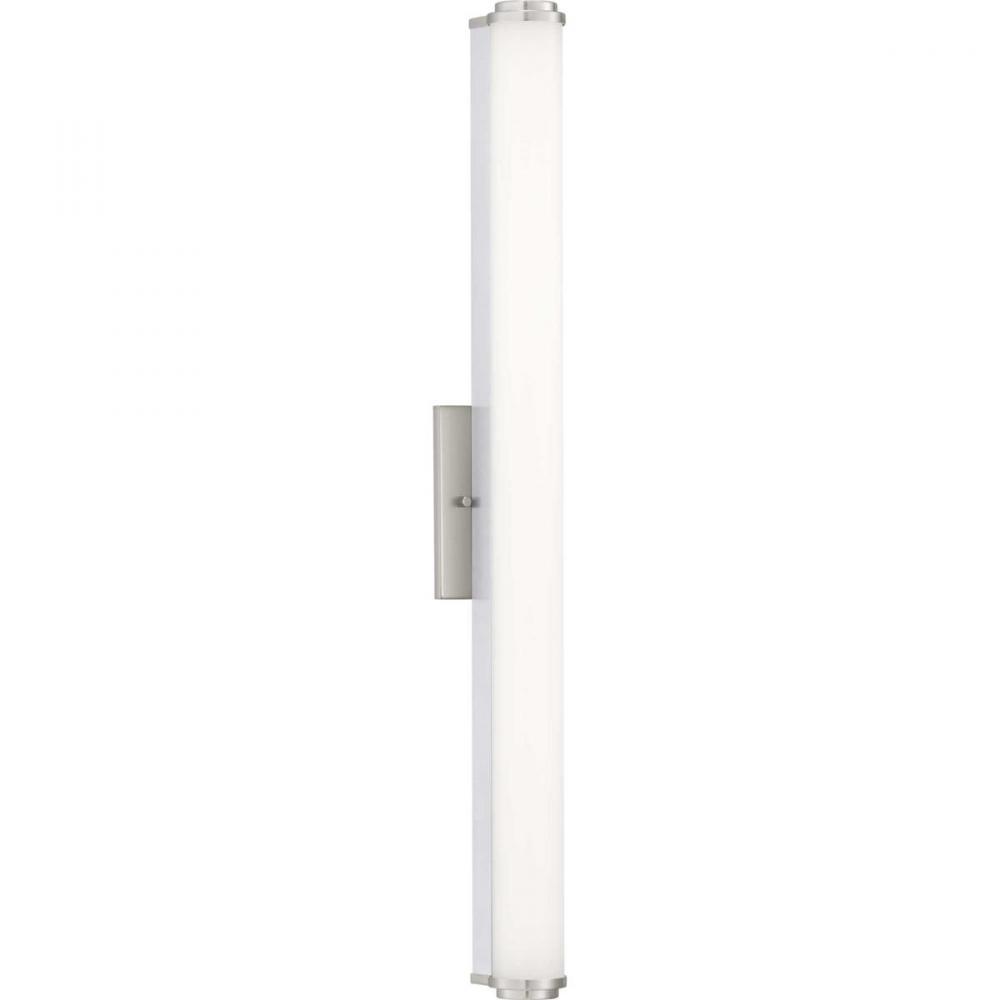 Ideal for a bathroom;Perfect for modern style settings;Beautiful brushed nickel finish;Crisp white acrylic shade;Fixture can mount horizontal and vertical;Includes 1 integrated LED (33 W), 2600 lumens, 3000 K, 90 CRI, dimmable;Measures 36-inch width by 4.