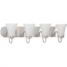 Pay homage to clean, modern-style inspiration with the immaculate design of the Classic four-light bath. A bold, Black backplate supports elegant, curved arms holding the four bell-shaped, etched glass shades. This striking, sophisticated fixture will oust shadows around a bathroom mirror, in a dining room, or wherever focused task light is desired in transitional settings.