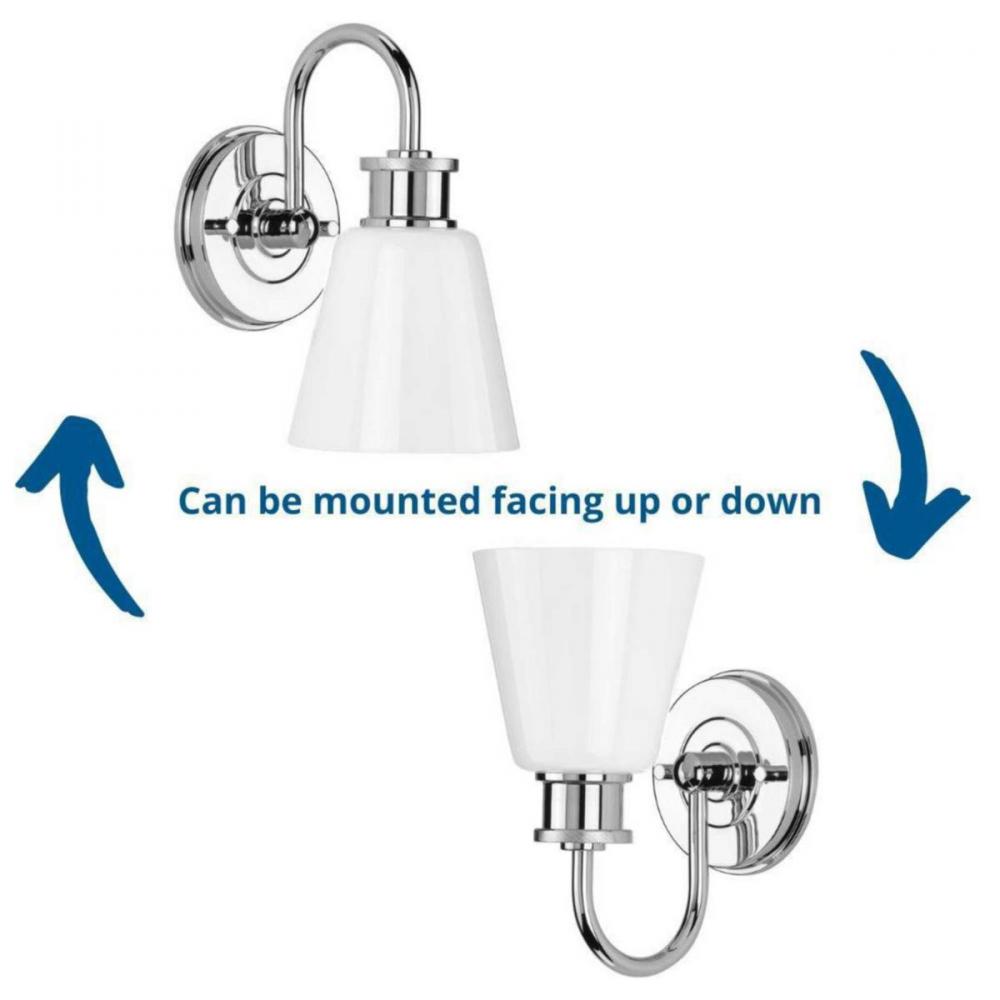 Provide nostalgic charm with the Ashford Collection 1-Light Polished Chrome Opal Glass Farmhouse Bath Vanity Light. The circular backplate, elegantly curved arm, and vintage light bases are coated in a beautiful polished chrome finish for a crisp aesthetic. A light source glows from inside an opal glass shade that skillfully blends the old with the new.