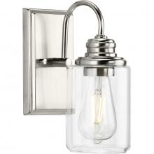 Enjoy delightful charming details with the Aiken Collection 1-Light Vintage Brass Clear Glass Vintage Bath Vanity Light. The beveled backplate, elegantly curved arm, and vintage light base are coated in a golden vintage brass finish. A light source glows from inside a clear glass shade reminiscent of vintage apothecary bottles.
