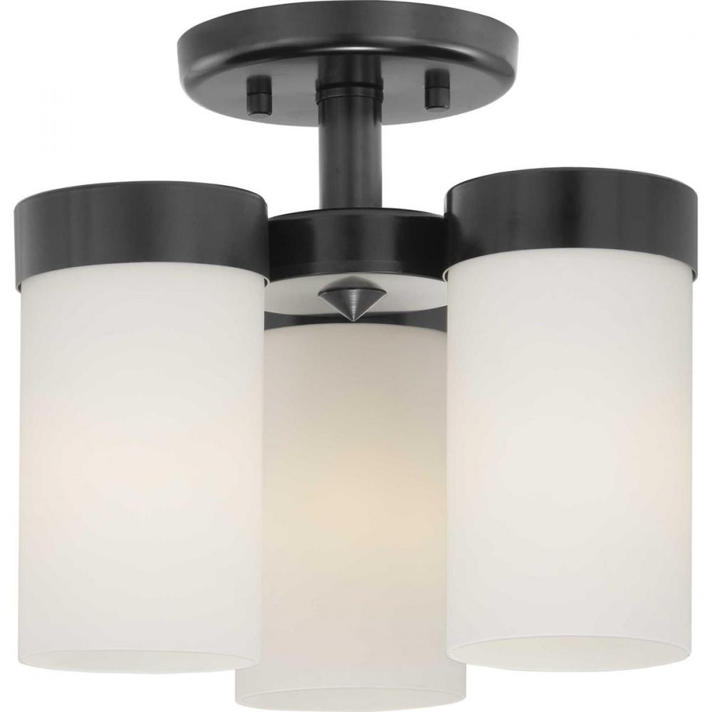 Achieve a Modern look with the Elevate Collection three-light flush mount. Etched glass white shades provide a striking contrast to the Matte Black finish. Fixtures can be installed with glass facing up or down for added customization.